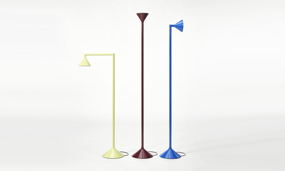 Ο Ολλανδός σχεδιαστής Lex Pott αναρωτήθηκε τι συμβαίνει όταν κόβεις έναν χαλύβδινο κύλινδρο στις 45 μοίρες και αρχίζεις να περιστρέφεις τα κομμάτια. Δύο λοξές τομές μετατρέπουν ένα φωτιστικό δαπέδου σε ένα πιο ευέλικτο αντικείμενο: περιστρέφοντάς το προς μία κατεύθυνση γίνεται προβολέας, προς άλλη κατεύθυνση γίνεται φωτιστικό ανάγνωσης, ενώ σε μία τρίτη δημιουργεί έμμεσο φωτισμό προς τα πάνω – κάθε επιλογή δημιουργεί διαφορετική ατμόσφαιρα στον ίδιο χώρο. Η λειτουργία έχει εμπνευστεί από τη γεωμετρία, και η παιχνιδιάρικη κίνηση της περιστροφής μεταμορφώνει το φωτιστικό κάθε φορά. Το κατοχυρωμένο σχέδιο διαθέτει καπέλο σε μορφή τρομπέτας και λεπτό μεταλλικό κορμό που αναδύεται από μια φαρδιά βάση σε σχήμα κώνου, διαθέσιμο σε 3 αποχρώσεις.