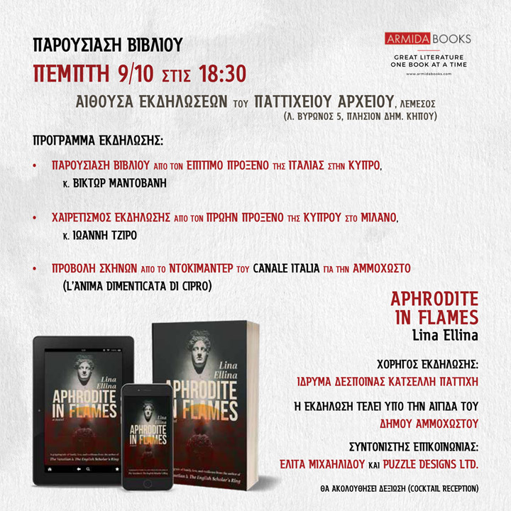 Την Πέμπτη, 9 Οκτωβρίου, στις 18.30, στην αίθουσα εκδηλώσεων Παττίχειου Αρχείου, θα πραγματοποιηθεί η παρουσίαση του βιβλίου της Λίνας Έλληνα «Aphrodite in Flames».