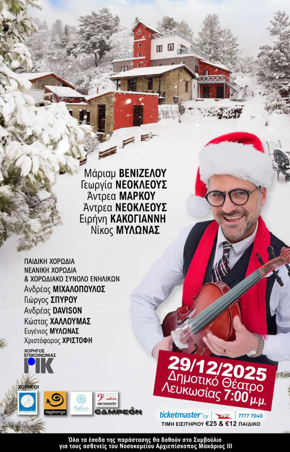 Το Συμβούλιο Επισκέψεων και Ευημερίας Ασθενών του Νοσοκομείου Αρχιεπίσκοπος Μακάριος Γ΄ παρουσιάζει τη συναυλία «Χριστούγεννα με τον Κώστα Κακογιάννη και τους φίλους του», μια εκδήλωση αφιερωμένη στην αγάπη, την ελπίδα και τη στήριξη των παιδιών που νοσηλεύονται στο νοσοκομείο.