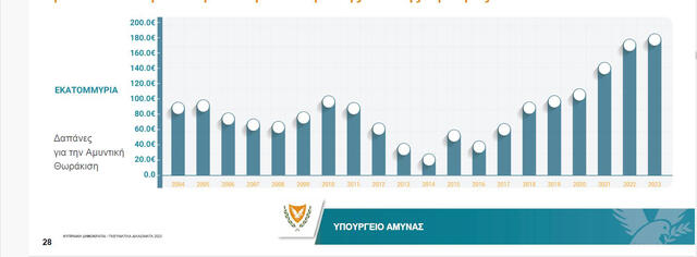 Στον προϋπολογισμό του Υπουργείου Άμυνας για το έτος 2026 αναφέρεται, επίσης, ότι για το έτος 2027 οι δαπάνες για την αμυντική θωράκιση θα αυξηθούν στα €180 εκατ. και για το έτος 2028 στα €175 εκατ. με ανοικτό το ενδεχόμενο αναθεώρησής τους προς τα πάνω. «Το Υπουργείο Άμυνας προχωρεί με σταθερά βήματα στην εκτέλεση του εξοπλιστικού προγράμματος που εκπονήθηκε σε συνεργασία με την ΕΦ, ανεβάζοντας τον προϋπολογισμό της αμυντικής θωράκισης στο υψηλότερο επίπεδο των τελευταίων χρόνων, πάντα στο πλαίσιο των οικονομικών δυνατοτήτων του κράτους», δήλωσε στον «Π» αρμόδια πηγή.
