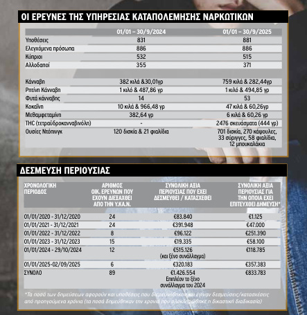 Την περίοδο Ιανουαρίου – Σεπτεμβρίου του 2024 κατασχέθηκαν 382 κιλά και 30,01 γραμμάρια κάνναβης, ενώ την αντίστοιχη φετινή περίοδο κατασχέθηκε σχεδόν η διπλάσια ποσότητα, και συγκεκριμένα 759 κιλά και 282,44 γραμμάρια.