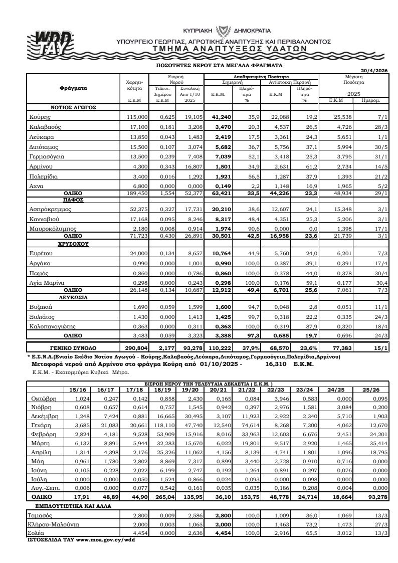 Σύμφωνα με τη σημερινή ενημέρωση του Τμήματος Αναπτύξεως Υδάτων, οι εισροές νερού στα φράγματα κατά το τελευταίο τριήμερο ήταν 2.177 Ε.Κ.Μ. νερού. Σημειώνεται ότι από την 1η του Οκτώβρη μέχρι και σήμερα Δευτέρα 20 Απριλίου, η συνολική εισροή ήταν 93. 278 Ε.Κ.Μ. νερού.