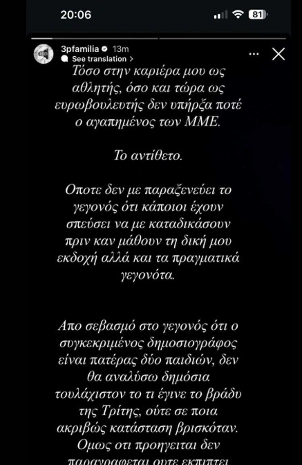 «Τόσο στην καριέρα μου ως αθλητής, όσο και τώρα ως ευρωβουλευτής δεν υπήρξα ποτέ ο αγαπημένος των ΜΜΕ. Το αντίθετο.