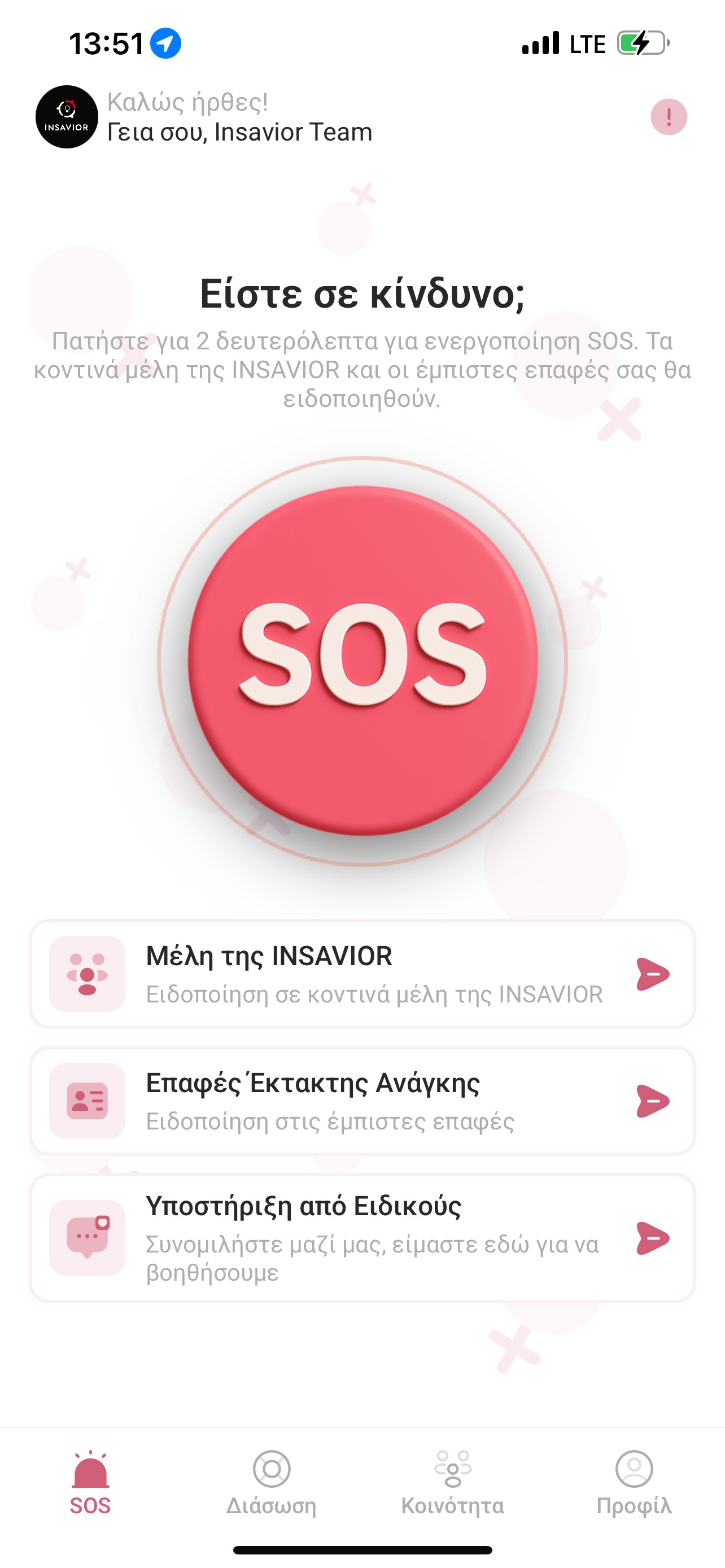 - High Alert (SOS): Ειδοποιεί τις κοντινές γυναίκες της κοινότητας και τις επαφές εκτάκτου ανάγκης.