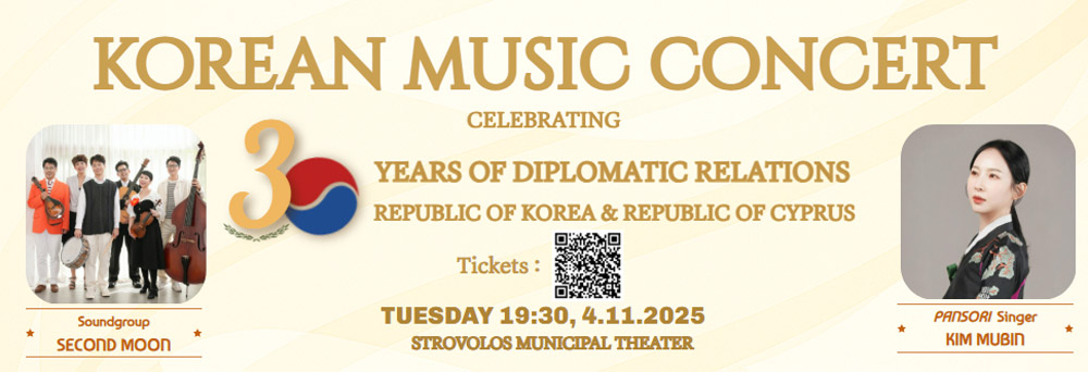 Με την ευκαιρία της 30ής επετείου διπλωματικών σχέσεων μεταξύ της Δημοκρατίας της Κορέας και της Κυπριακής Δημοκρατίας, μια συναυλία κορεατικής μουσικής θα πραγματοποιηθεί την Τρίτη, 4 Νοεμβρίου 2025 στην Κύπρο.