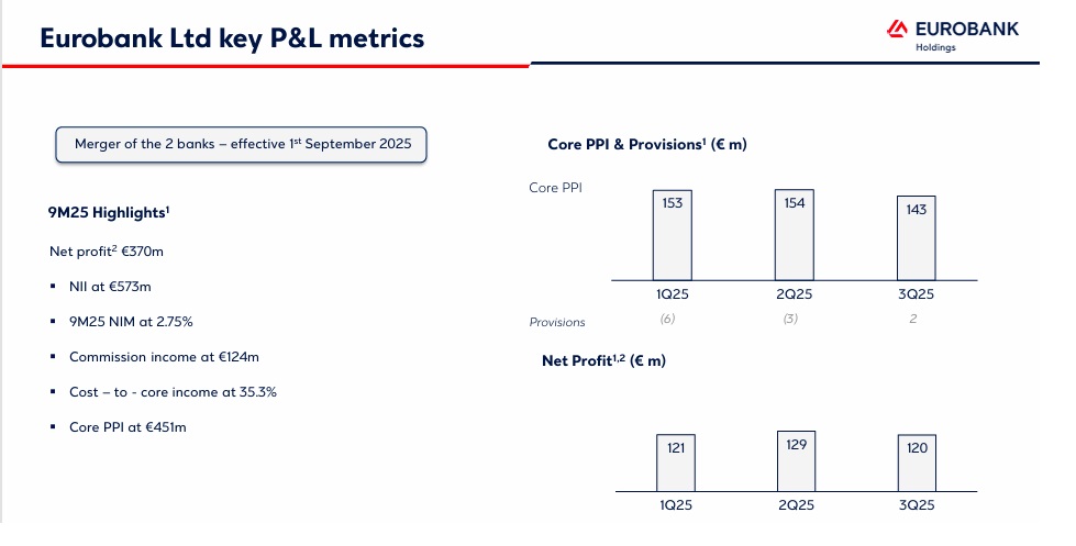 Σύμφωνα με οικονομικά αποτελέσματα που ανακοινώθηκαν την Πέμπτη, τα κέρδη της Eurobank Ltd που συνεισφέρουν κατά 35% στη συνολική κερδοφορία της Eurobank Holdings μειώθηκαν το τρίτο τρίμηνο του 2025 στα €120 εκατ. από €129 εκατ. το προηγούμενο τρίμηνο.