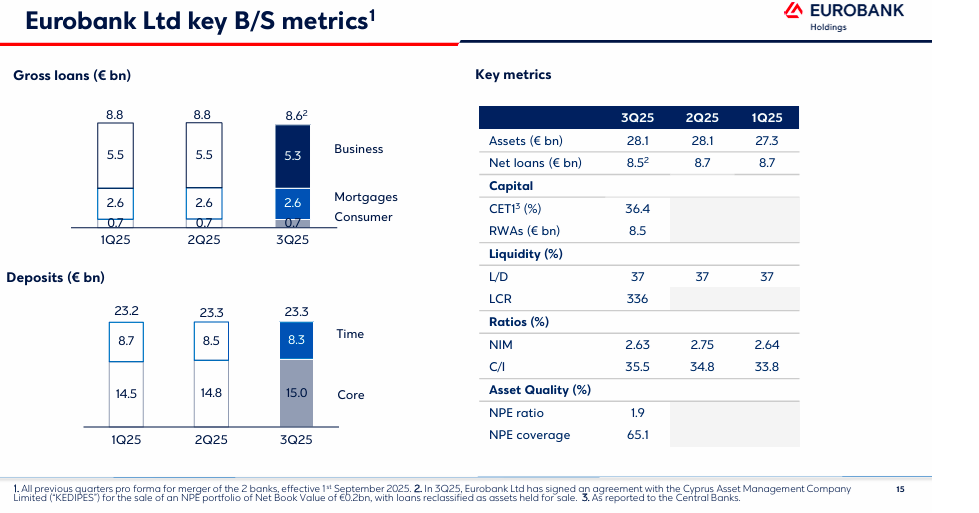 Αναφορικά με τις καταθέσεις του ομίλου που φθάνουν τα €79 δισ. το τρίτο τρίμηνο του 2025, τα €43,4 δισ. προέρχονται από την Ελλάδα, τα €23,3 δισ. από την Κύπρο και τα €9,7 δισ. από τη Βουλγαρία.