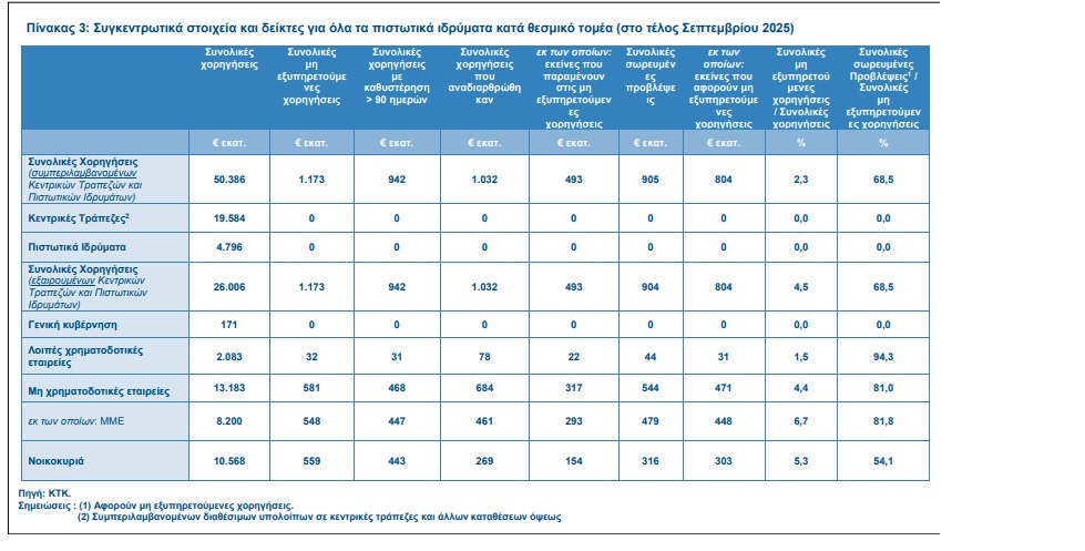 Η Κεντρική Τράπεζα σε σχόλιο που συνοδεύει τη δημοσιοποίηση των στοιχείων αναφέρει ότι οι συνολικές χορηγήσεις που έτυχαν αναδιάρθρωσης στο τέλος Σεπτεμβρίου 2025 ανέρχονταν στα €1 δισ., από τις οποίες χορηγήσεις ύψους €0,5 δισ. εξακολουθούν να περιλαμβάνονται στα ΜΕΔ. Ο δείκτης κάλυψης των ΜΕΧ με προβλέψεις επισφάλειας αυξήθηκε σε 68,5% στο τέλος Σεπτεμβρίου 2025, σε σύγκριση με 62,0% τέλος Ιουνίου 2025.