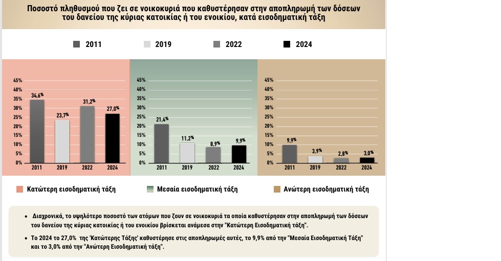Το 2024 το 27% της κατώτερης τάξης καθυστέρησε στις αποπληρωμές αυτές από 31,2% το 2023, το 9,9% από τη μεσαία εισοδηματική τάξη από 8,9% το 2023 και το 3% από την ανώτερη εισοδηματική τάξη από 2,8% το 2023.