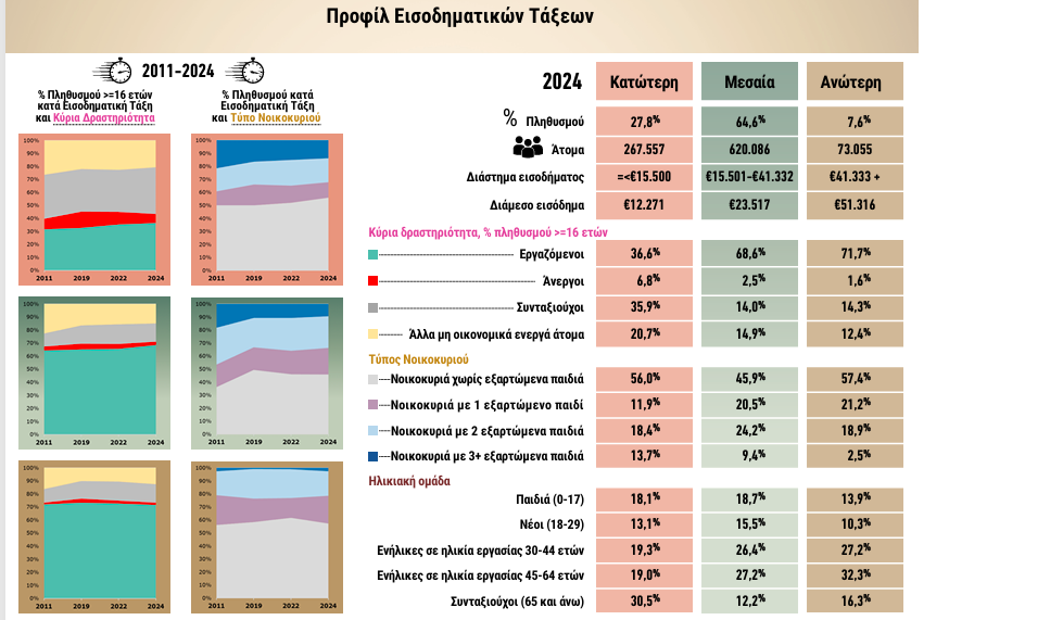 Το Διάμεσο Ισοδύναμο Διαθέσιμο Εισόδημα ανέρχεται σε €12.271 για την κατώτερη τάξη το 2024 από €11.497 το 2023, για τη μεσαία τάξη σε €23.517 από €21.979 το 2023 ενώ για την ανώτερη στα €51.316 από €46.944.