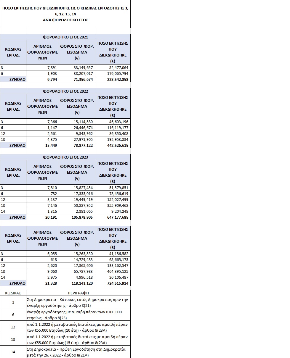 Το 2023, συνολικά 20.191 φορολογούμενοι διεκδίκησαν φοροαπαλλαγές €647,2 εκατ. ενώ το 2022 οι φοροαπαλλαγές για 15.449 άτομα ήταν €442,5 εκατ. και το 2021 9.794 άτομα είχαν φοροελαφρύνσεις €228,5 εκατ.
