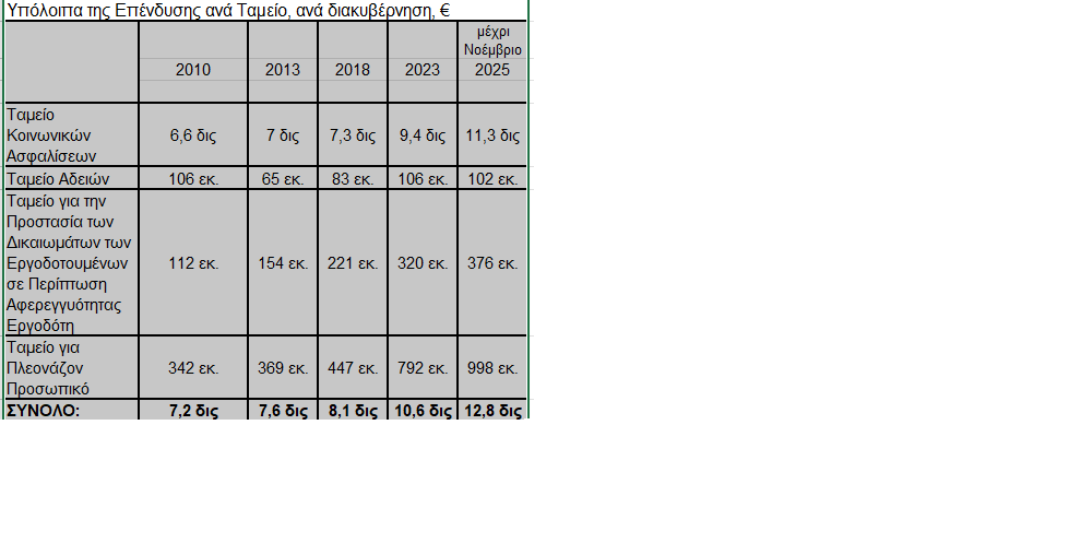 Το συνολικό χρέος του κράτους προς όλα τα Ταμεία ανέρχεται στα €12,8 δισ., από €10,6 δισ. το 2023, €8,1 δισ. το 2018, €7,6 δισ. το 2013 και €7,2 δισ. το 2010.