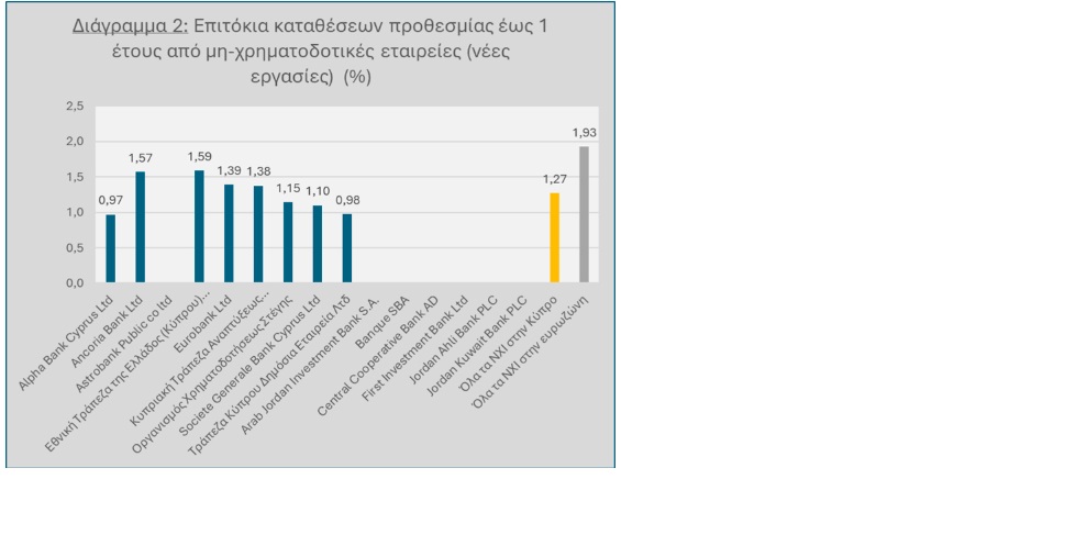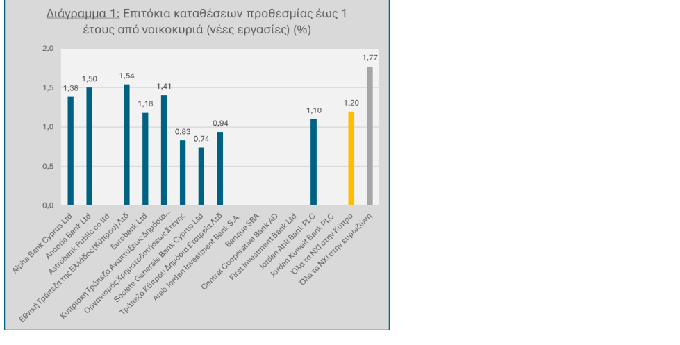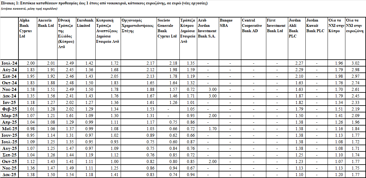 Σύμφωνα με τα στοιχεία, τον Δεκέμβριο του 2025 το υψηλότερο καταθετικό επιτόκιο είχε η Εθνική Τράπεζα της Ελλάδος (Κύπρου) φθάνοντας το 1,54% από 1,49% τον Νοέμβριο.
