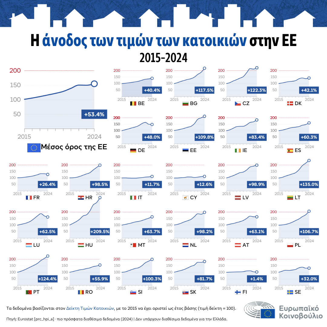 Μεταξύ 2015 και 2024, οι τιμές των κατοικιών στην ΕΕ αυξήθηκαν κατά μέσο όρο κατά 53,4%. Οι μεγαλύτερες αυξήσεις παρατηρήθηκαν στην Ουγγαρία (+209,5%), τη Λιθουανία (+135%) και την Πορτογαλία (+124,4%). Στην Κύπρο, η αύξηση ανέρχεται στο 12,6%.
