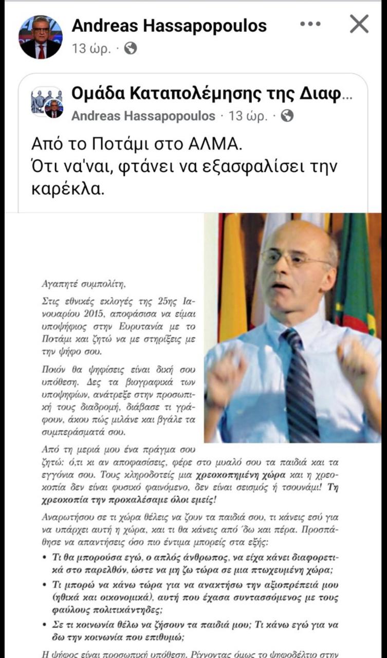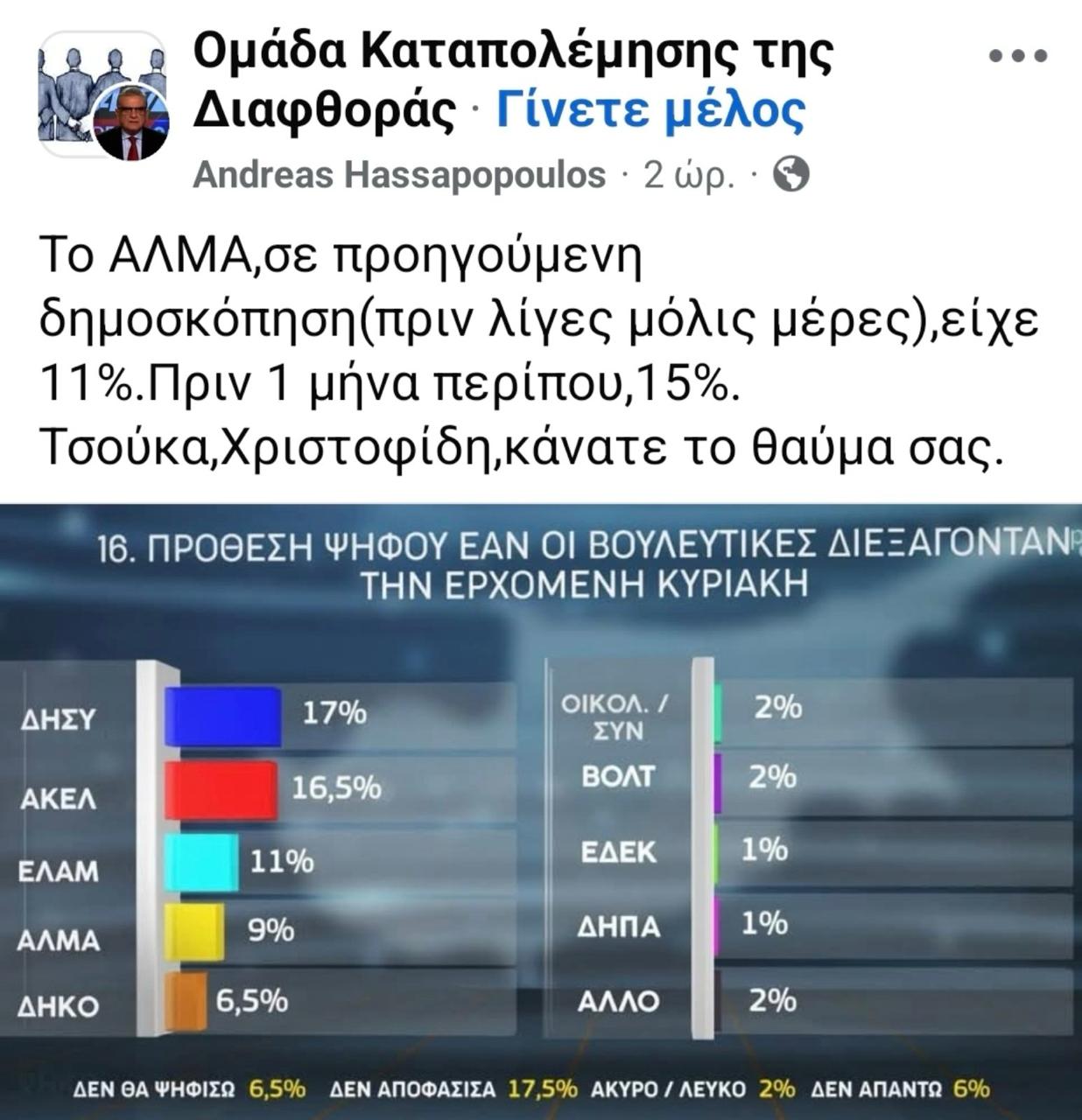 Σε άλλη ανάρτηση στην «Ομάδα Καταπολέμησης της Διαφθοράς», ο κ. Χασαπόπουλος σχολιάζει τα αποτελέσματα της δημοσκόπησης του SIGMA που δείχνει ότι το «ΑΛΜΑ» λαμβάνει 9%, αναφέροντας ότι «πριν λίγες μόλις ημέρες είχε 11%, πριν ένα μήνα περίπου 15%». Μάλιστα επέρριψε ευθύνες για την πτώση των ποσοστών του κινήματος σε δύο συγκεκριμένα μέλη και συγκεκριμένα στον αναπληρωτή επικεφαλής Χαρίδημο Τσούκα και τον πρώην πρύτανη του Πανεπιστημίου Κύπρου Κωνσταντίνο Χριστοφίδη, λέγοντας ότι «κάνατε το θαύμα σας».