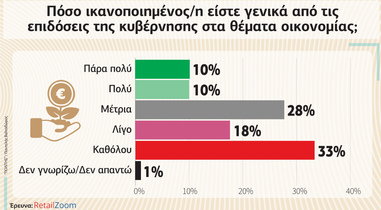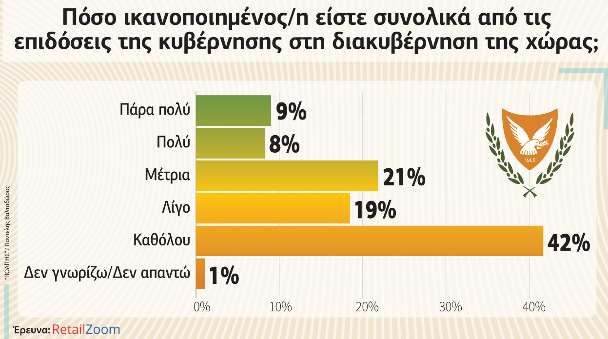 Ποσοστό 20% δηλώνει πάρα πολύ ή πολύ ικανοποιημένο από τις επιδόσεις της κυβέρνησης στην οικονομία. Το 28% θεωρεί μέτριες τις επιδόσεις της κυβέρνησης, ενώ λίγο ή καθόλου ψηφίζει το 51% των ερωτηθέντων. Ένας τους δύο Κύπριους εν ολίγοις θεωρεί κακές τις επιδόσεις της κυβέρνησης στην οικονομία, ενώ και το 28% που τις θεωρεί μέτριες δεν μπορεί να επιμετρηθεί ως θετική ψήφος.