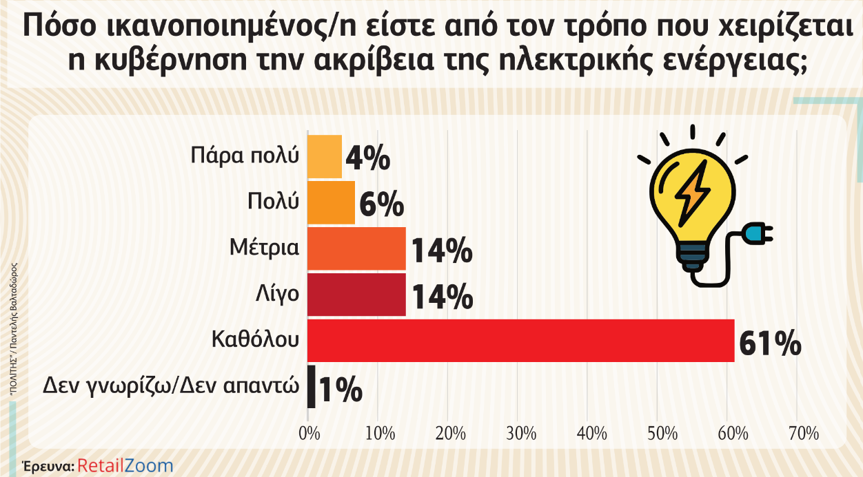 Αρνητικό είναι το πρόσημο των πολιτών και στο ερώτημα που αφορά τους χειρισμούς της κυβέρνησης για τα θέματα ηλεκτρικής ενέργειας. Το 75% απάντησε από λίγο έως καθόλου ικανοποιημένο από τους χειρισμούς της κυβέρνησης, ενώ μέτρια θεωρεί το 14%. Οι πολύ έως πάρα πολύ ικανοποιημένοι από τους χειρισμούς του Προέδρου μετά βίας πιάνουν το 10%.