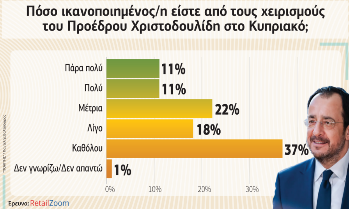 Η γενική θετική εντύπωση σε ό,τι αφορά τη διακυβέρνηση Χριστοδουλίδη κινείται στο 17%, ενώ το 21% θεωρεί τις επιδόσεις της μέτριες. Αρνητική ψήφο δίνει το 61% των ερωτηθέντων. Το μεγαλύτερο αρνητικό ποσοστό το δίνουν οι γυναίκες (63%) ενώ η πόλη που καταψηφίζει την κυβέρνηση είναι η Λευκωσία με 65%. Ηλικιακά οι Κύπριοι πολίτες 55-64 ετών δεν είναι ικανοποιημένοι με τις επιδόσεις της κυβέρνησης σε ποσοστό 67%.
