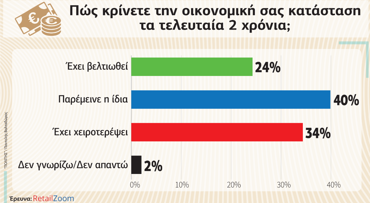 Ένας στους τέσσερις Κύπριους (το 24%) λέει ότι η οικονομική του κατάσταση έχει βελτιωθεί, το 40% ότι παρέμεινε η ίδια και το 34% ότι έχει χειροτερέψει. Με λίγα λόγια κάποιοι γίνονται πλουσιότεροι, κάποιοι λένε ότι γίνονται φτωχότεροι, ενώ η πλειοψηφία (40%) των ερωτηθέντων αναφέρει ότι η κατάστασή τους παραμένει σταθερή. Ηλικιακά τη μεγαλύτερη οικονομική βελτίωση δηλώνει ότι έχει η ηλικία 25-34 με ποσοστό 33% ενώ στην ηλικιακή ομάδα 35-44 ένα ποσοστό 35% δηλώνει ότι η κατάστασή του χειροτερεύει.