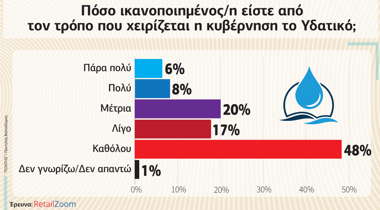 Οι πρόσφατες πολιτικές του Προέδρου Χριστοδουλίδη σε σχέση με τις αφαλατώσεις δεν φαίνεται να έπεισαν τους πολίτες, αφού στο ερώτημα πόσο ικανοποιημένοι είναι από τον τρόπο που χειρίζεται το υδατικό, σχεδόν ένας στους δύο πολίτες απαντάει καθόλου. Αν προσθέσουμε και αυτούς που απάντησαν λίγο, τότε ένα 65% λέει όχι στη διαχείριση του υδατικού στην κυβέρνηση. Το 6% απάντησε πάρα πολύ, ενώ το 8% απαντάει πολύ. Στις ηλικιακές κατηγορίες, οι νεαρότεροι φαίνεται να πείστηκαν περισσότερο από τον Πρόεδρο.