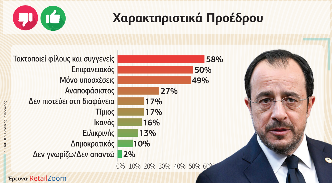 Σε ό,τι αφορά τα προσωπικά χαρακτηριστικά του Προέδρου της Δημοκρατίας τα οποία επηρεάζουν και τον τρόπο διακυβέρνησής του, τα πράγματα μάλλον έχουν χειροτερέψει. Τον περασμένο Φεβρουάριο ένα ποσοστό 34% έκρινε αρνητικά τον Πρόεδρο για τα φαινόμενα νεποτισμού, ενώ σήμερα το ποσοστό που πιστεύει ότι ο Πρόεδρος βολεύει συγγενείς και φίλους έχει πάει στο 58%, με το φαινόμενο αυτό να επιδρά τραγικά σε ό,τι αφορά την πίστη των πολιτών στην αξιοκρατία και τη χρηστή διοίκηση και γενικά στη διακυβέρνηση της χώρας από τον Νίκο Χριστοδουλίδη. Ελαφρώς αυξημένα είναι και τα αρνητικά ποσοστά των πολιτών σε σχέση με τον Φεβρουάριο (48%) που θεωρούν ότι ο Πρόεδρος υπόσχεται πολλά και κάνει λίγα (49%).