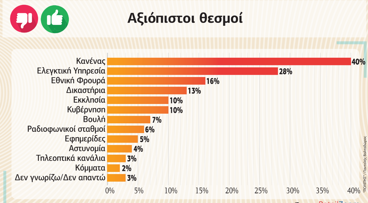 Οι θεσμοί που διασώζονται κάπως είναι η Ελεγκτική Υπηρεσία 28% και η Εθνική Φρουρά με 16%. Οι υπόλοιποι απαξιώνονται πλήρως με 8 στους 10 πολίτες ή και περισσότερο να πιστεύουν ότι δεν αξίζει καμιά εμπιστοσύνη στους θεσμούς.