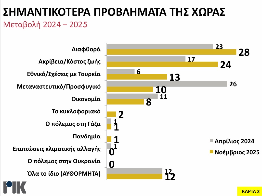 Την εβδομάδα που μας πέρασε, δημοσιοποιήθηκαν δύο μεγάλες δημοσκοπήσεις-ακτινογραφία της σημερινής κατάστασης του πολιτικού συστήματος και της συμπεριφοράς του εκλογικού Σώματος. Η μία της MRC Cypronetwork Ltd για λογαριασμό του ΡΙΚ και η άλλη της IMR για λογαριασμό του Reporter. Αυτή της Cypronetwork (με μεγαλύτερη αδιευκρίνιστη ψήφο), για την πολιτική κουλτούρα και την εκλογική συμπεριφορά, πραγματοποιήθηκε με τηλεφωνικές συνεντεύξεις από τις 20 Οκτωβρίου μέχρι τις 3 Νοεμβρίου 2025, με δείγμα 1.418 προσώπων, με διάστημα εμπιστοσύνης 95% και σφάλμα +/- 2,9%. Η έρευνα της IMR ήταν επίσης τηλεφωνική, πραγματοποιήθηκε 3 με 10 Νοεμβρίου 2025, μέγεθος δείγματος 1.000 πρόσωπα, βαθμός βεβαιότητας 95% και σφάλμα +/- 3,1%.