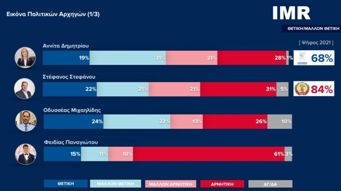 4. Το ΑΛΜΑ διεκδικεί την 4η θέση –για την ώρα φαίνεται να απειλείται κυρίως από την Άμεση Δημοκρατία. Έχουν μια κάμψη τα ποσοστά του αλλά παραμένει η δύναμη με την πιο οριζόντια διείσδυση στο εκλογικό Σώμα. Πολύ ενδιαφέρον το ότι καταγράφεται 14% εισροή στο ΑΛΜΑ από το ΔΗΚΟ, 8% από το ΑΚΕΛ, 5% από τον ΔΗΣΥ, 7% από το ΕΛΑΜ. Η εικόνα του Οδυσσέα Μιχαηλίδη είναι η πιο θετική ανάμεσα σε όλους τους αρχηγούς (IMR/Reporter).