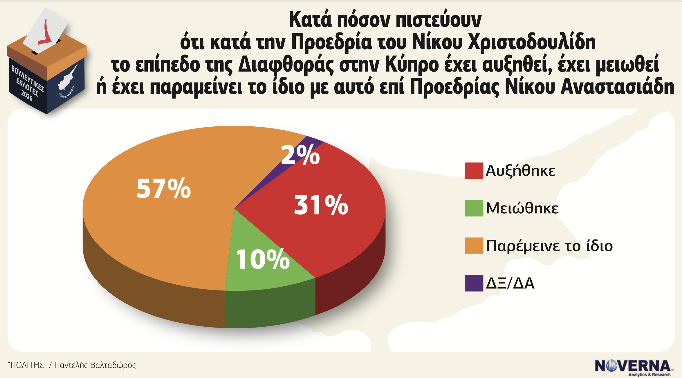 Ιδιαίτερο ενδιαφέρον παρουσιάζει το εύρημα σχετικά με το αν το επίπεδο της διαφθοράς έχει αλλάξει επί προεδρίας Χριστοδουλίδη σε σύγκριση με την προηγούμενη περίοδο. Το 57% απαντά ότι «παραμένει το ίδιο», 31% ότι «έχει αυξηθεί» και μόλις 10% ότι «έχει μειωθεί».