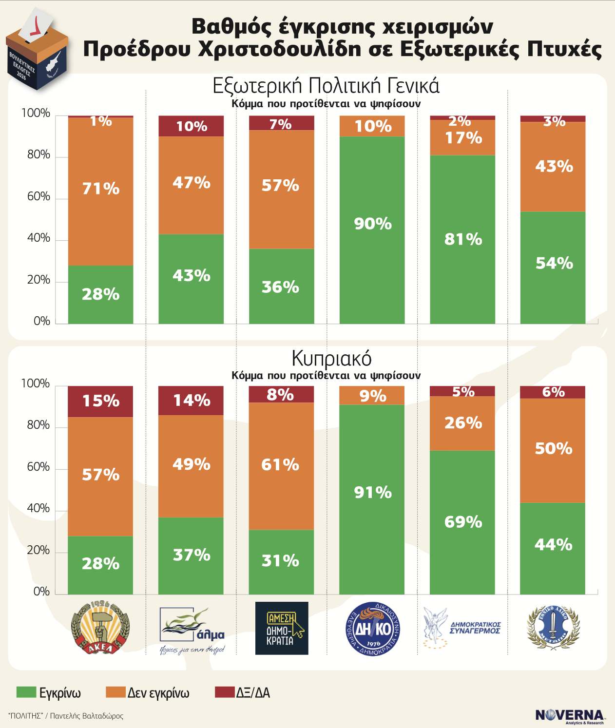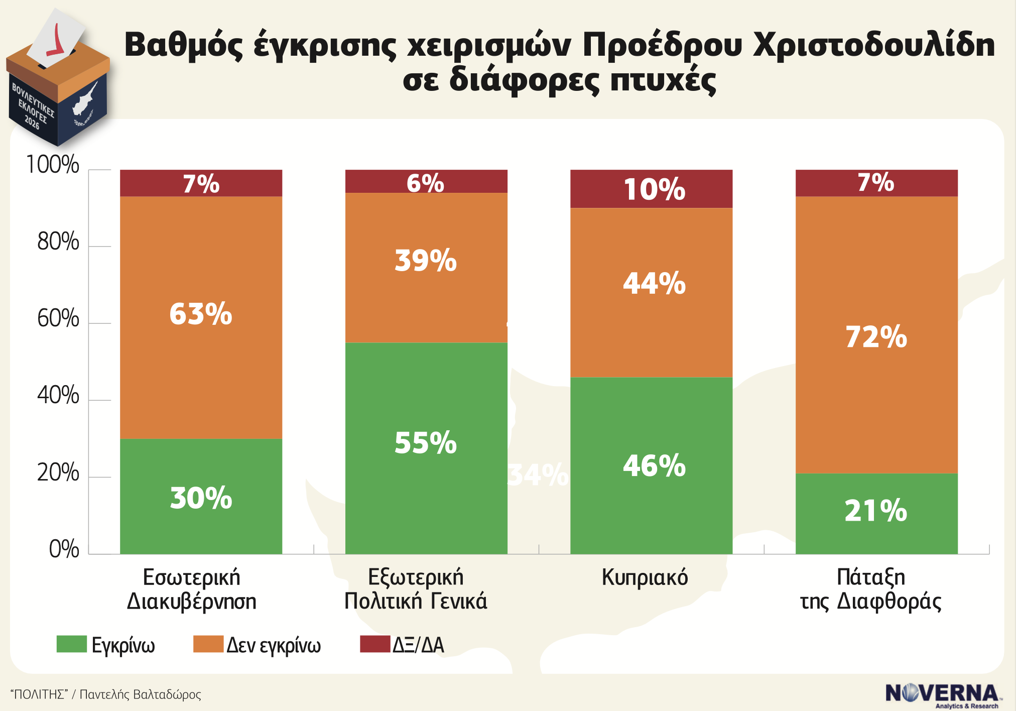 Αντίθετα, η εικόνα είναι σαφώς καλύτερη στην εξωτερική πολιτική. Το 55% εγκρίνει συνολικά τους χειρισμούς του Προέδρου στο διεθνές πεδίο, ενώ στο Κυπριακό το 46% δηλώνει ότι τους εγκρίνει, με το ποσοστό αποδοκιμασίας να είναι ελαφρώς χαμηλότερο σε σχέση με τα εσωτερικά ζητήματα. Εδώ, ο Πρόεδρος εμφανίζεται να έχει κτίσει πολιτικό κεφάλαιο. Η διάκριση είναι σαφής: ο Πρόεδρος αξιολογείται θετικά ως διεθνής παίκτης και αρνητικά ως διαχειριστής της εσωτερικής πραγματικότητας.