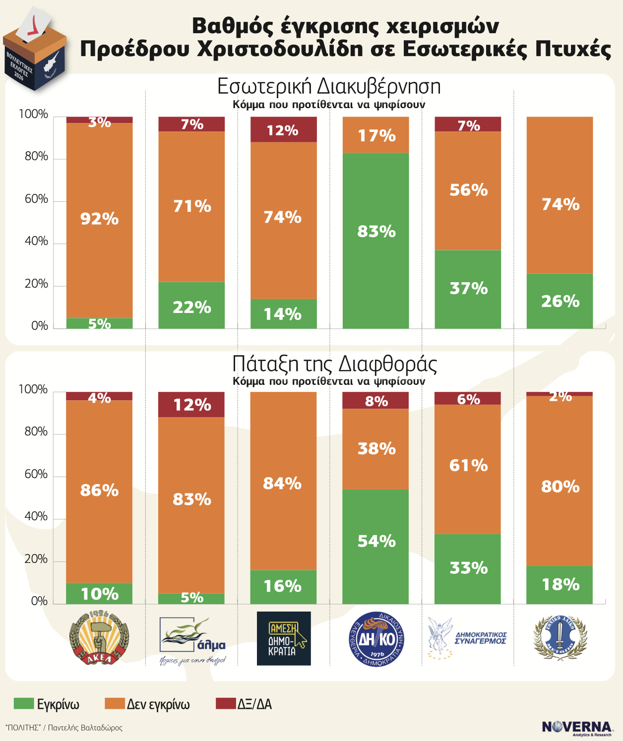 Η ανάλυση κατά κομματική προτίμηση δείχνει επίσης ότι η στήριξη προς τον Πρόεδρο προέρχεται κυρίως από τον χώρο του ΔΗΚΟ, όπου καταγράφονται υψηλά ποσοστά έγκρισης τόσο στην εσωτερική διακυβέρνηση όσο και στη διαχείριση της διαφθοράς. Στον ΔΗΣΥ η εικόνα είναι πιο σύνθετη, με σημαντικό τμήμα των ψηφοφόρων να εμφανίζεται επιφυλακτικό, ενώ στον χώρο της αντιπολίτευσης η αποδοκιμασία είναι συντριπτική.