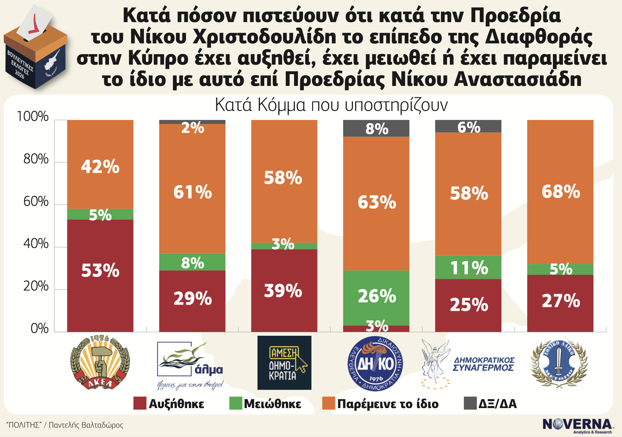 Το μήνυμα είναι σαφές: η πλειοψηφία των πολιτών δεν διαπιστώνει βελτίωση. Ένας στους τρεις μάλιστα θεωρεί την κυβέρνηση Χριστοδουλίδη χειρότερη στη διαχείριση της διαφθοράς από την προηγούμενη κυβέρνηση Νίκου Αναστασιάδη. Ακόμη και όσοι δεν υιοθετούν την άποψη ότι τα πράγματα χειροτέρεψαν, δεν θεωρούν ότι υπήρξε ουσιαστική πρόοδος. Σε μια χώρα όπου η διαφθορά υπήρξε καθοριστικός παράγοντας πολιτικής φθοράς την προηγούμενη δεκαετία, η αίσθηση στασιμότητας λειτουργεί πολιτικά επιβαρυντικά.