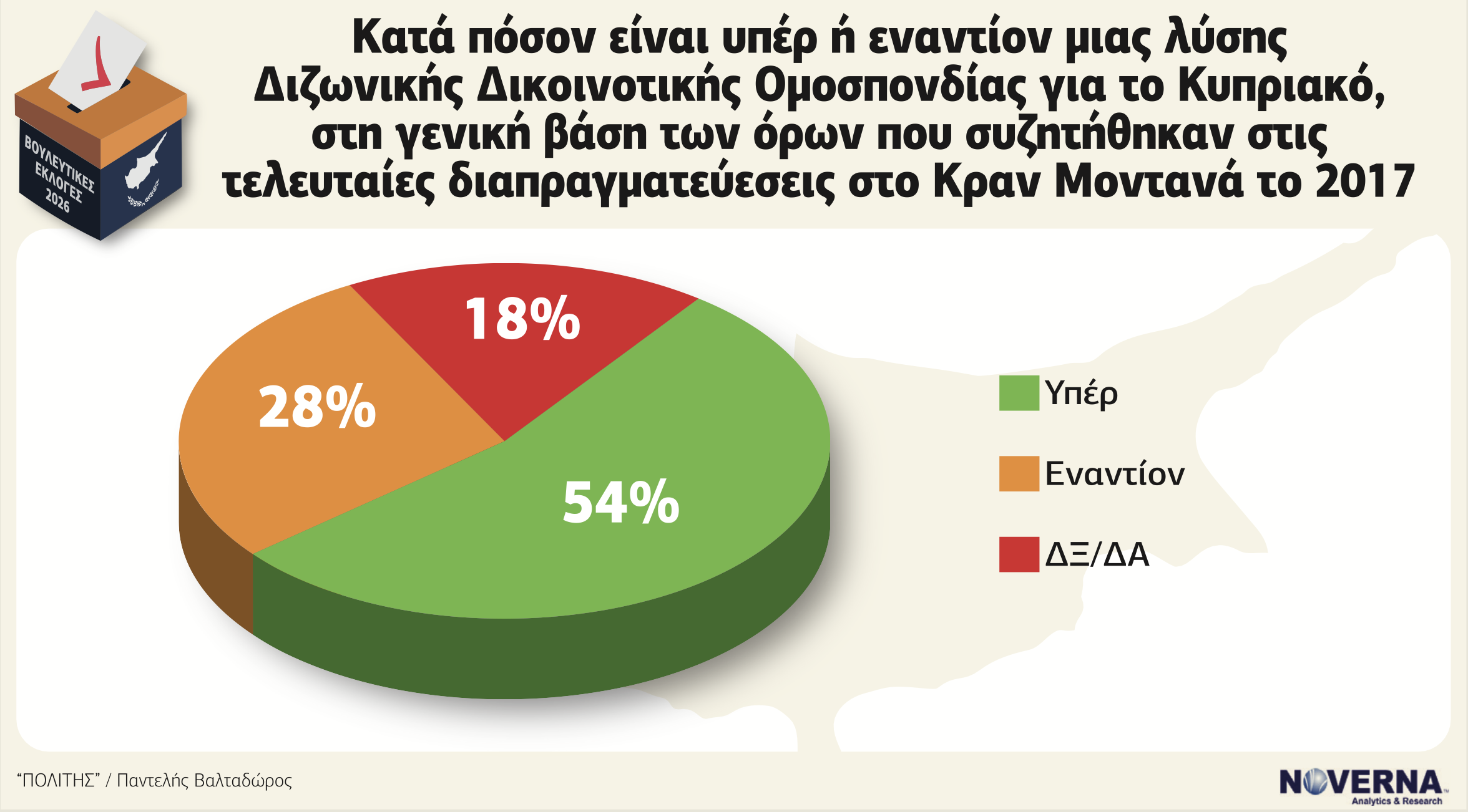 Παρά την κριτική προς τη διακυβέρνηση, στο εθνικό ζήτημα καταγράφεται πλειοψηφική στήριξη στη λύση Διζωνικής Δικοινοτικής Ομοσπονδίας στη βάση των όσων συζητήθηκαν στο Κραν Μοντανά το 2017. Το 54% δηλώνει υπέρ, 28% κατά και 18% δεν τοποθετείται.