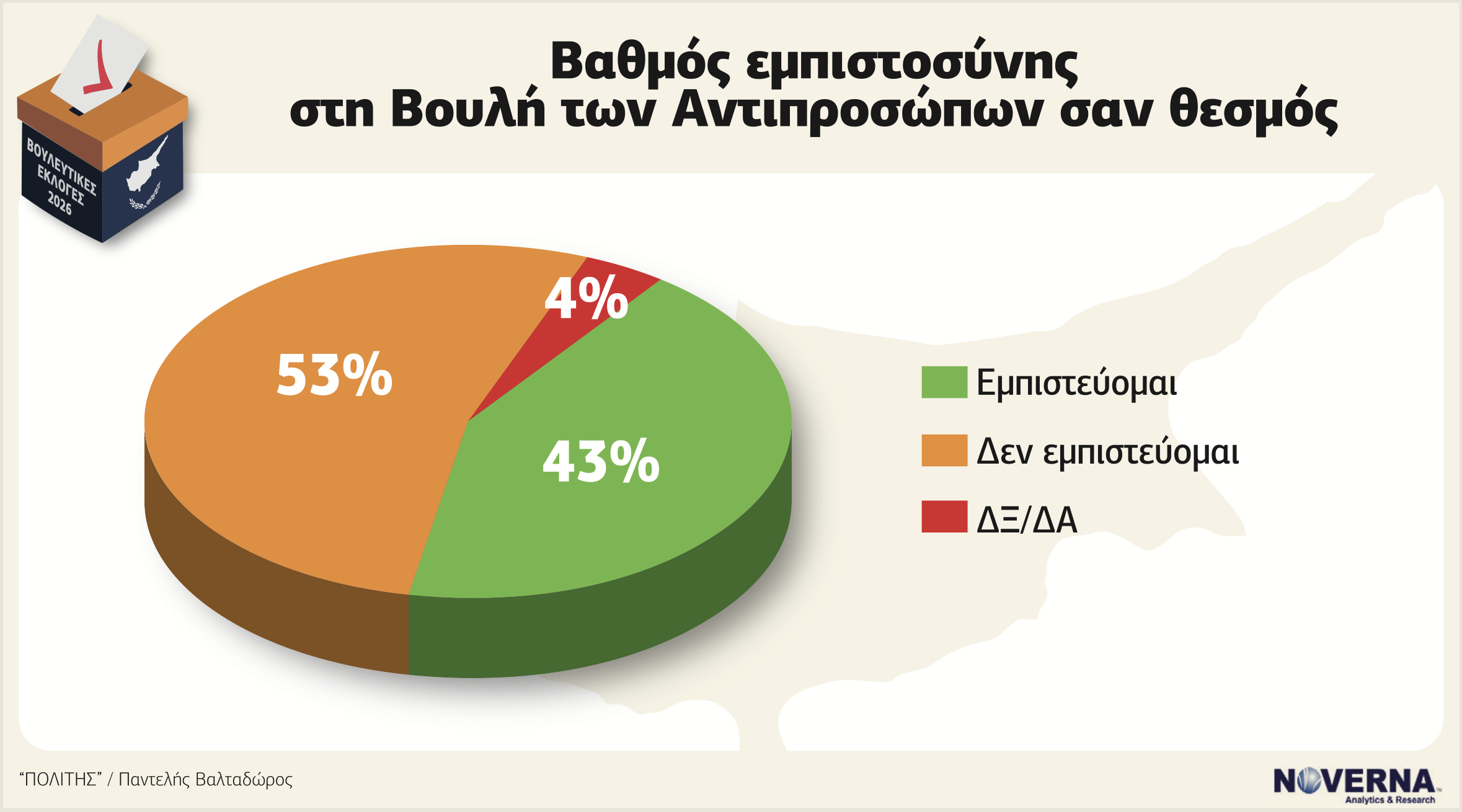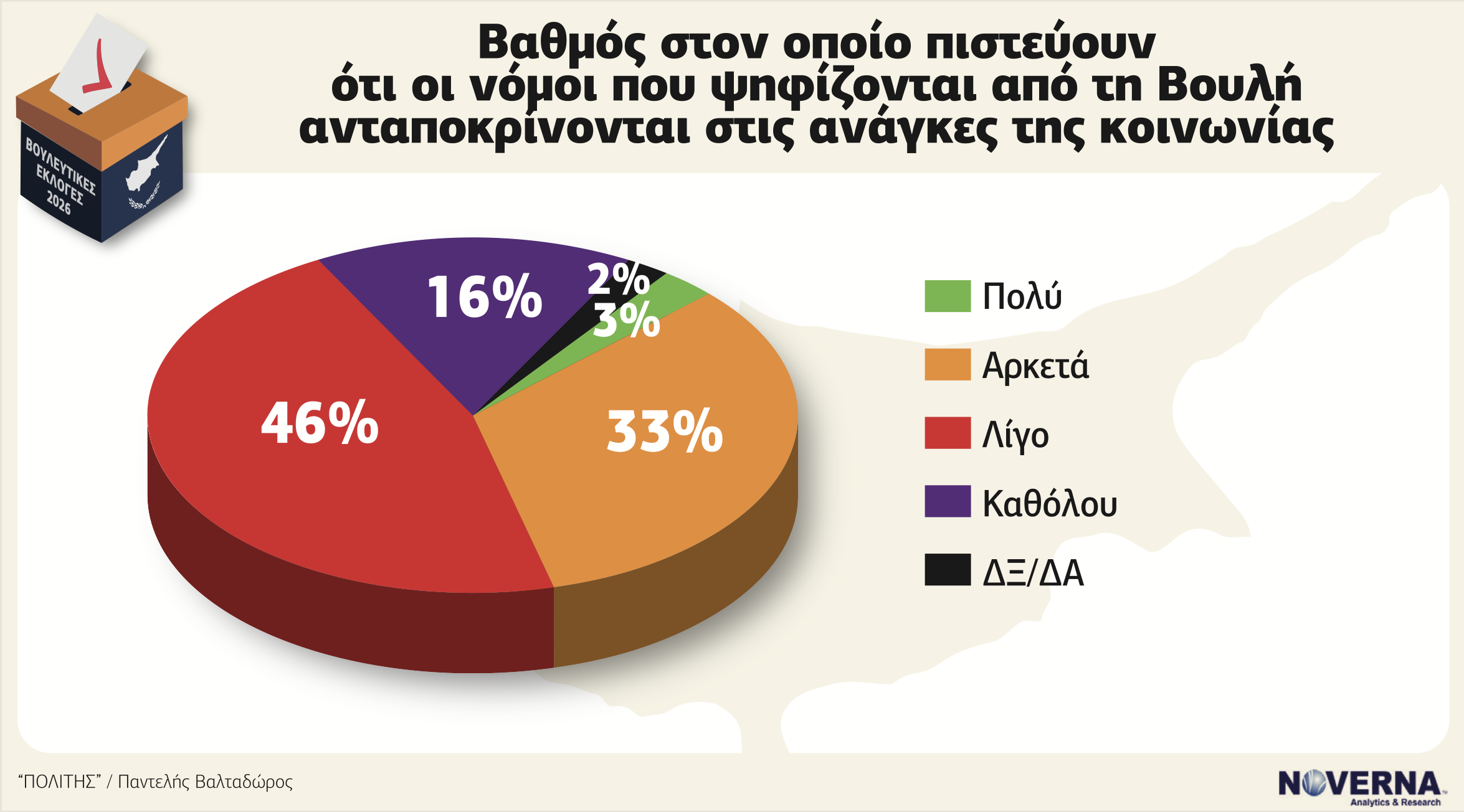 Μετά τον Πρόεδρο, το βλέμμα στρέφεται στη Βουλή των Αντιπροσώπων. Και εδώ η εικόνα δεν είναι ενθαρρυντική. Το 53% δηλώνει ότι δεν εμπιστεύεται τη Βουλή ως θεσμό, έναντι 43% που απαντά ότι την εμπιστεύεται. Πρόκειται για οριακή αλλά καθαρή πλειοψηφία δυσπιστίας. Η Βουλή εισέρχεται στην προεκλογική περίοδο με σημαντικό έλλειμμα αξιοπιστίας. Ακόμη πιο αποκαλυπτική είναι η απάντηση στο ερώτημα κατά πόσον οι νόμοι που ψηφίζονται ανταποκρίνονται στις ανάγκες της κοινωνίας. Μόλις 3% απαντά «πολύ», 33% «αρκετά», ενώ 46% «λίγο» και 16% «καθόλου». Δηλαδή 62% των πολιτών θεωρεί ότι το νομοθετικό έργο ανταποκρίνεται ελλιπώς ή καθόλου στις κοινωνικές ανάγκες.