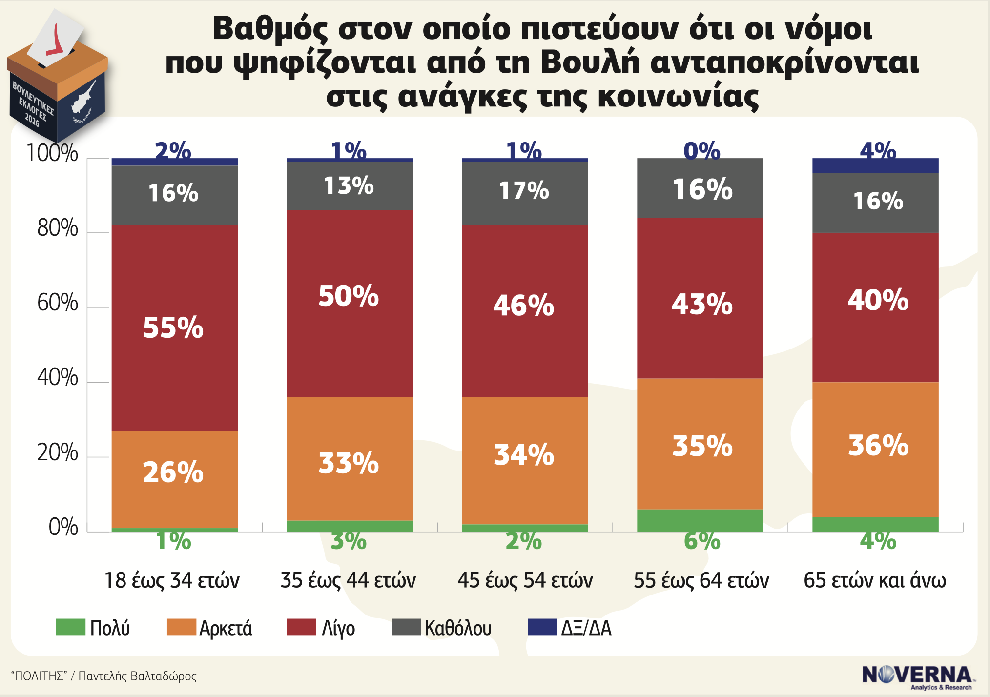 Η ανάλυση κατά ηλικία δείχνει ότι οι νεότερες γενιές είναι πιο αυστηρές ή έστω απόλυτες. Στην ηλικιακή ομάδα 18-34 ετών, η πλειοψηφία θεωρεί ότι οι νόμοι ανταποκρίνονται «λίγο» στις ανάγκες της κοινωνίας, ενώ τα ποσοστά «πολύ» είναι σχεδόν μηδενικά. Αντίθετα, στις μεγαλύτερες ηλικίες αυξάνεται το «αρκετά» και εμφανίζεται ελαφρώς μεγαλύτερη θετική αποτίμηση. Η διαφοροποίηση αυτή υποδηλώνει γενεακή απόσταση από το πολιτικό σύστημα. Οι νεότεροι δεν εμφανίζονται εξοργισμένοι, αλλά μάλλον αποστασιοποιημένοι.