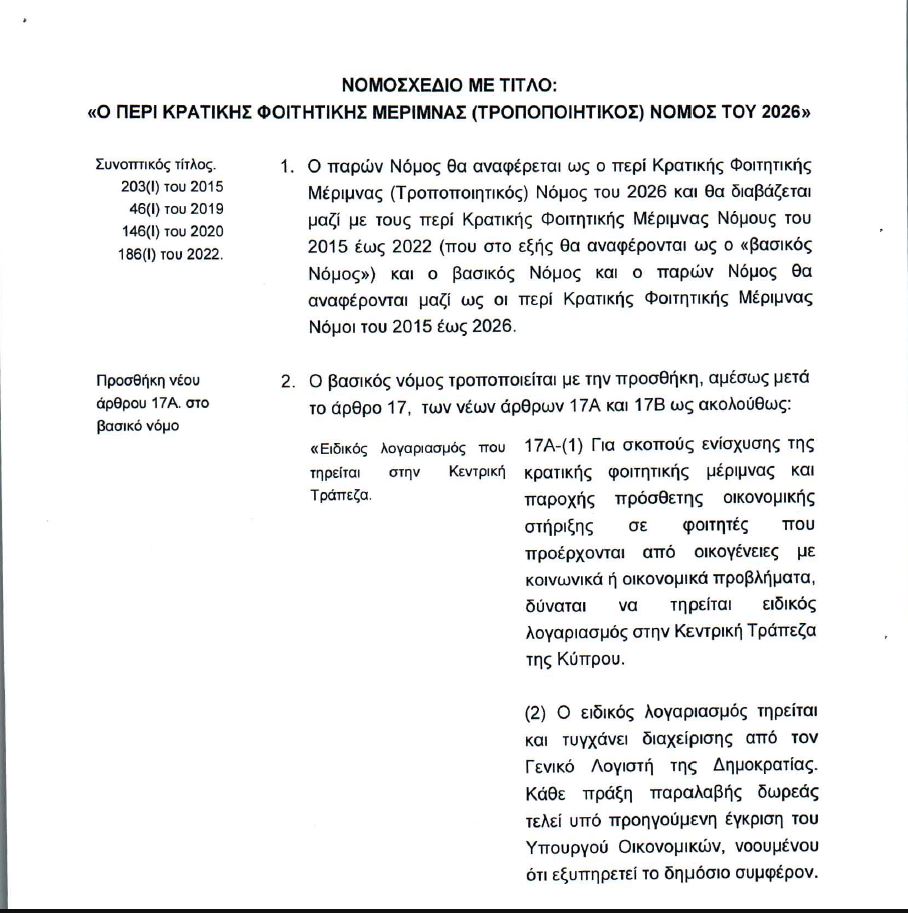 Τον τραπεζικό λογαριασμό, ο οποίος υπάρχει ήδη – πρόκειται για τον λογαριασμό που χρησιμοποιεί ο Φορέας – θα εποπτεύει ο Γενικός Λογιστής της Δημοκρατίας. Σε αυτόν θα μπορούν να προβαίνουν σε δωρεές ιδιώτες, νομικά πρόσωπα, ιδρύματα και οργανωμένα σύνολα, για σκοπούς ενίσχυσης άπορων φοιτητών μέσω της Υπηρεσίας Χορηγιών και Επιδομάτων του Υπουργείου Οικονομικών, στη βάση θεσμοθετημένων κριτηρίων που θα καθοριστούν με Κανονισμούς.
