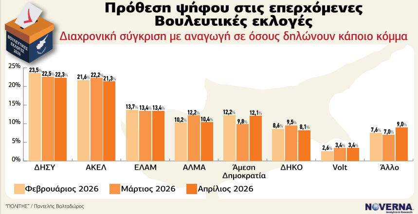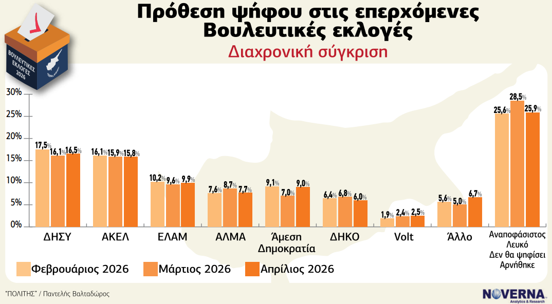 Η διαχρονική σύγκριση Φεβρουαρίου, Μαρτίου και Απριλίου 2026 δείχνει σχετική σταθερότητα με μικρές διακυμάνσεις. Ο ΔΗΣΥ κινείται από 17,5% τον Φεβρουάριο σε 16,1% τον Μάρτιο και 16,5% τον Απρίλιο, παρουσιάζοντας ελαφρά ανάκαμψη. Το ΑΚΕΛ διατηρεί επίσης σταθερή πορεία, με 16,1%, 15,9% και 15,8% αντίστοιχα. Το ΕΛΑΜ παραμένει κοντά στο 10%, ενώ η Άμεση Δημοκρατία εμφανίζει αξιοσημείωτη άνοδο από 7,0% τον Μάρτιο σε 9,0% τον Απρίλιο. Αντίθετα, το ΔΗΚΟ παρουσιάζει στασιμότητα, ενώ το VOLT ενισχύεται σταδιακά.