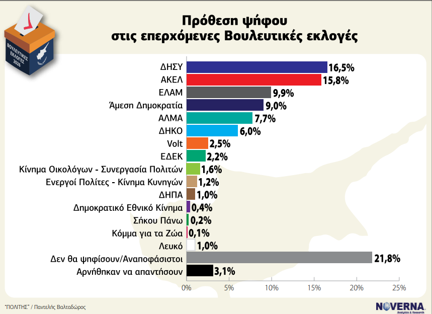 Στην πρόθεση ψήφου επί του συνόλου ο ΔΗΣΥ καταγράφει 16,5% και διατηρεί οριακό προβάδισμα έναντι του ΑΚΕΛ, το οποίο ακολουθεί με 15,8%. Η διαφορά μεταξύ των δύο κομμάτων είναι μικρή και εντός των ορίων στατιστικού σφάλματος, στοιχείο που επιβεβαιώνει τη συνεχιζόμενη ισορροπία δυνάμεων στο διπολικό σκηνικό. Τρίτη δύναμη εμφανίζεται το ΕΛΑΜ με 9,9%, επιβεβαιώνοντας τη σταθεροποίηση του κόμματος σε διψήφια σχεδόν ποσοστά και την εδραίωσή του ως βασικού παίκτη.