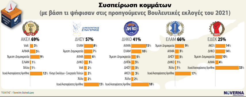 Ιδιαίτερο ενδιαφέρον παρουσιάζει η εικόνα όταν γίνει αναγωγή μόνο σε όσους δηλώνουν κόμμα. Σε αυτήν την περίπτωση, ο ΔΗΣΥ ανεβαίνει στο 22,3% και το ΑΚΕΛ στο 21,3%, διατηρώντας τη μεταξύ τους απόσταση. Το ΕΛΑΜ ενισχύεται στο 13,4%, ενώ η Άμεση Δημοκρατία φτάνει το 12,1%. Το ΑΛΜΑ καταγράφει 10,4% και το ΔΗΚΟ 8,1%. Η αναγωγή αυτή αναδεικνύει πιο καθαρά τη συσχέτιση δυνάμεων, αφαιρώντας την επίδραση των αναποφάσιστων.