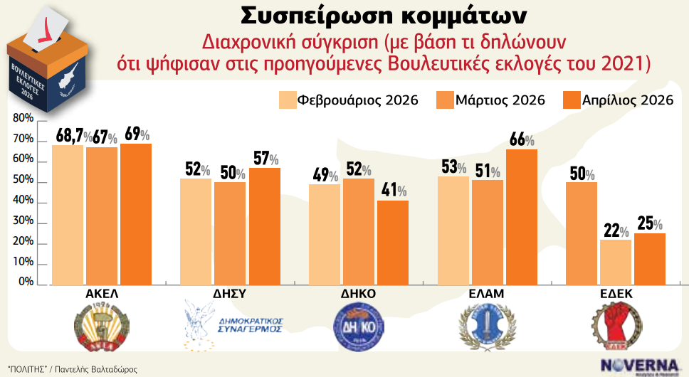 Η διαχρονική εξέλιξη της συσπείρωσης δείχνει ότι το ΑΚΕΛ ενισχύεται ελαφρώς, ενώ το ΕΛΑΜ παρουσιάζει σημαντική άνοδο τον Απρίλιο. Ο ΔΗΣΥ ανακάμπτει μετά από μικρή πτώση, ενώ το ΔΗΚΟ καταγράφει αξιοσημείωτη μείωση.