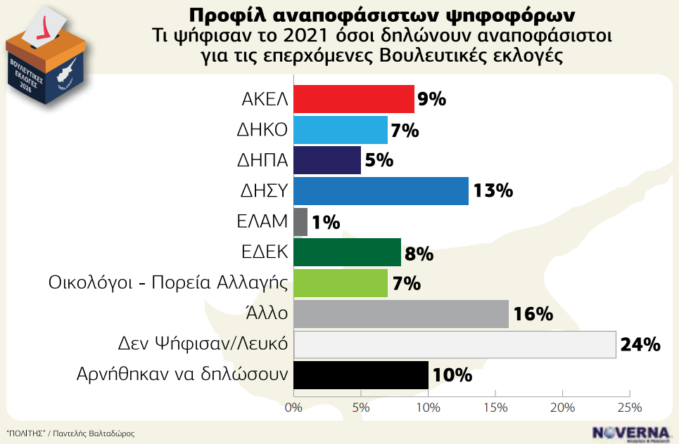 Το προφίλ των αναποφάσιστων αποκαλύπτει σημαντικές πληροφορίες. Ένα 24% δηλώνει ότι δεν ψήφισε ή έριξε λευκό το 2021, ενώ 16% προέρχεται από άλλους χώρους. Από τα παραδοσιακά κόμματα, 13% προέρχεται από τον ΔΗΣΥ, 9% από το ΑΚΕΛ και 8% από το ΔΗΚΟ. Το γεγονός ότι οι αναποφάσιστοι προέρχονται από όλο το πολιτικό φάσμα δείχνει ότι η εκλογική μάχη παραμένει ανοιχτή.