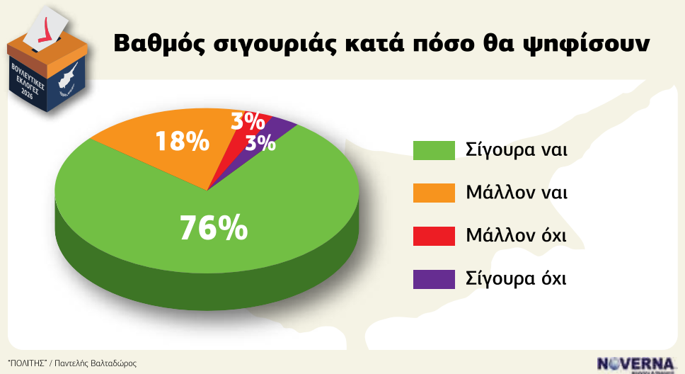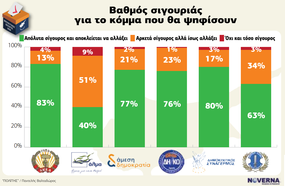 Σημαντικό είναι και το στοιχείο της βεβαιότητας ψήφου ανά κόμμα. Οι ψηφοφόροι του ΑΚΕΛ εμφανίζονται πιο σταθεροί, με 83% να δηλώνουν απολύτως σίγουροι. Ακολουθεί ο ΔΗΣΥ με 80% και το ΕΛΑΜ με 63%. Αντίθετα, οι ψηφοφόροι του ΑΛΜΑ εμφανίζονται πιο αμφίρροποι, με μόλις 40% απόλυτα βέβαιους και 51% να δηλώνουν ότι μπορεί να αλλάξουν γνώμη. Το στοιχείο αυτό υποδηλώνει ότι οι νεότεροι ή οι λιγότερο εδραιωμένοι σχηματισμοί διαθέτουν πιο «ρευστό» εκλογικό ακροατήριο.